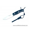 Cuchillo Joker EMBER F CM123-P, hoja con acero sandvik 14C28N, vaciado plano, empuñadura de MICARTA NEGRA e incluye FUNDA de cuero con pedernal.
