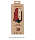 El mango ergonómico de madera de fresno única tiene una hoja negra de 2,5 mm de espesor hecha de acero inoxidable sueco reciclado, que combinado ofrece equilibrio y estabilidad en cada corte. Gracias a la geometría del mango, es posible una variedad de agarres flexibles, que pueden ser útiles cuando necesita dividir, picar, rebanar o pelar. El revestimiento de PC negro crea un contraste equilibrado entre la madera de fresno brillante y el borde brillante de la hoja. La funda de cuero curtido al vegetal protege el borde afilado de las superficies que pueden desafilar el cuchillo.