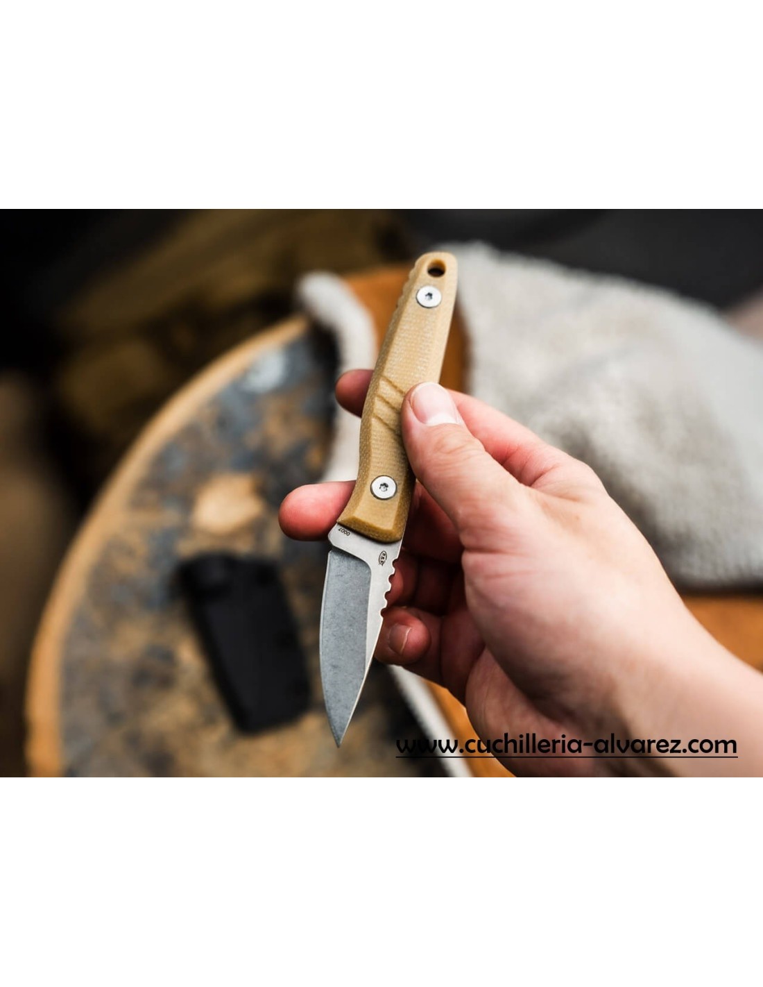 Con una longitud de hoja inferior a 6 cm, el Böker Plus Five Point Nine, del que toma su nombre, está muy por debajo del límite de 12 cm establecido por la Ley de Armas alemana y, por lo tanto, puede llevarse como un cuchillo de hoja fija sin ningún reparo. Esta pequeña potencia no necesita esconderse de sus homólogos más grandes, como lo demuestra su robusta construcción de espiga completa y sus características probadas: una hoja de punta caída hecha de acero 440C con un acabado lavado a la piedra y cachas de mango convexas hechas de Micarta marrón claro . Thomas Krug, un artista profesional del tatuaje personalizado de MBF Messer (Mein Bester Freund) en Alemania, demuestra su habilidad no solo con su aguja, sino que también infunde su sentido de la estética en el diseño de este cuchillo de hoja fija. Las distintivas ranuras bordean el lomo de la hoja y la parte trasera del mango para una sensación y un control excepcionales, mientras que las cachas del mango atornilladas presentan hendiduras similares a branquias. La forma y las características de la hoja hacen del Five Point Nine el cuchillo de repuesto o de cuello ideal para el uso diario. Incluye un orificio para cordón y una funda de Kydex a medida.