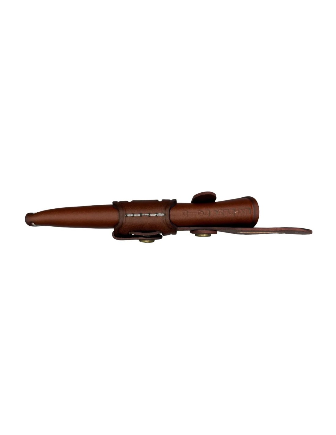 Cada cuchillo VENATUS se acompaña de una funda de cuero, elaborada con el mismo cuidado reservado para la hoja. Pero no se trata solo de estética: es un elemento técnico, diseñado para adaptarse al cuerpo y los movimientos del cazador. Es la primera funda de cuero ambidiestra y modular, que permite llevarla en diferentes configuraciones: