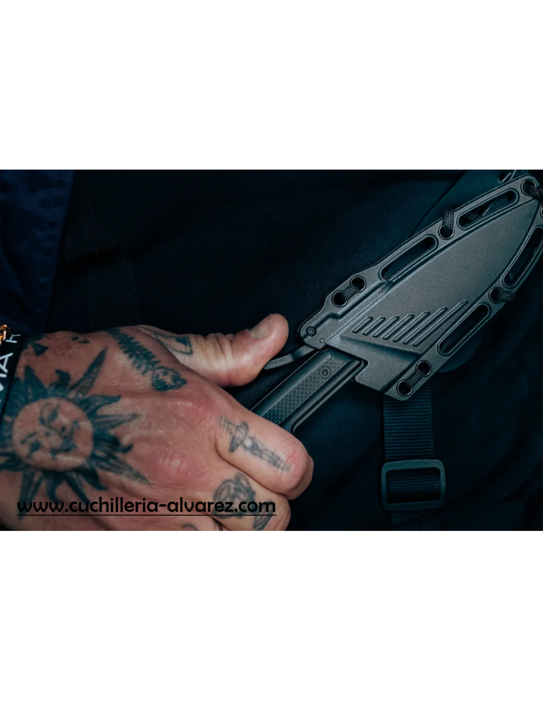 La protección inversa protege la mano en caso de impacto, evitando que se deslice hacia la hoja, incluso en impactos fuertes. El sistema de retención bloquea la hoja en la funda y requiere un movimiento preciso para liberarla: evita extracciones accidentales y dificulta enormemente su extracción durante un contacto cercano.