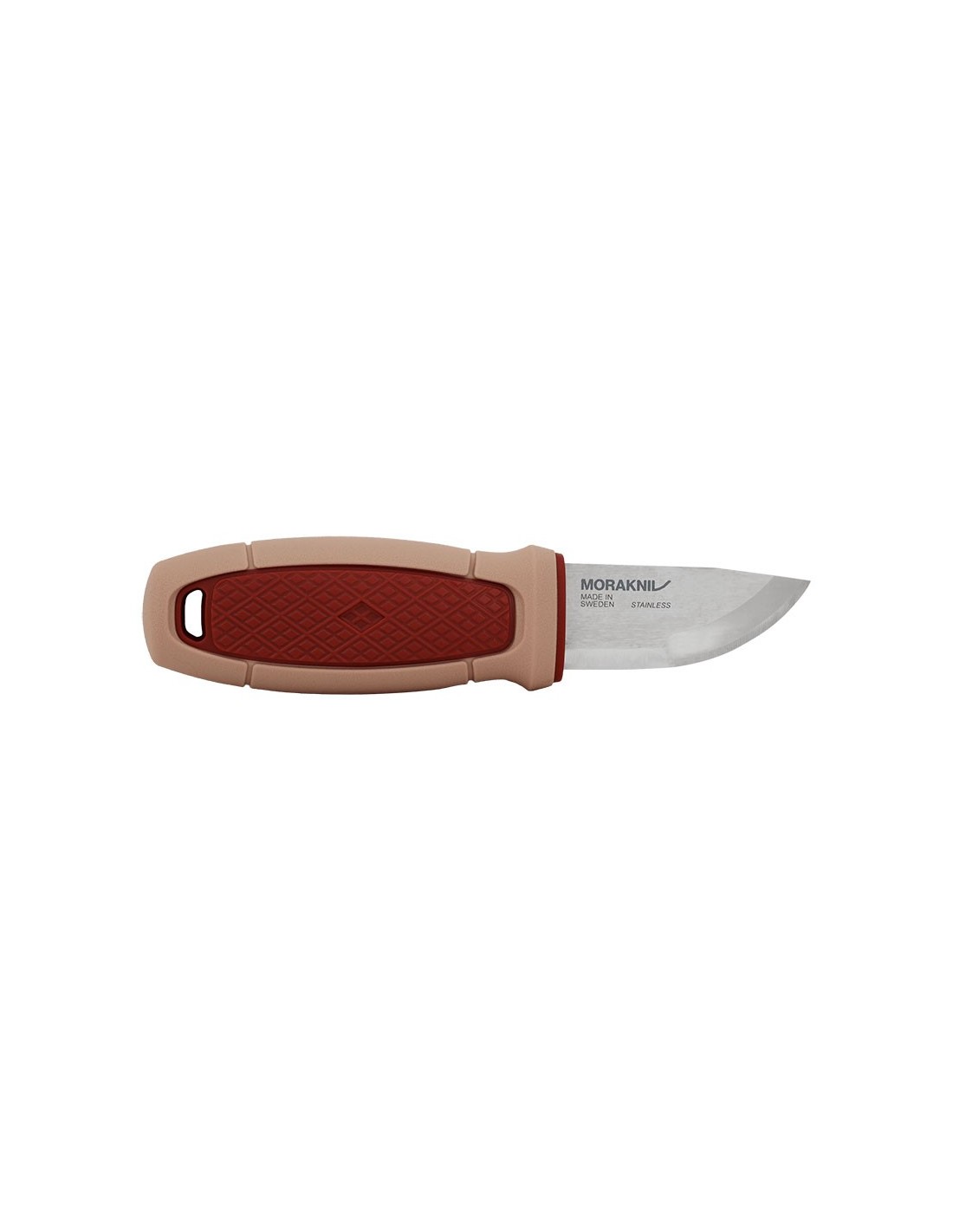 El color del año 2026 fusiona la tradición artesanal de Morakniv con los colores y el diseño de Dalarna. La arenisca Orsa y el rojo Dala reflejan la fusión entre el tono claro y natural de la arenisca y el clásico rojo Dala, un homenaje a la artesanía y la historia. La hoja de 59 mm de largo, fabricada en acero inoxidable sueco (12C27), tiene un grosor de 2 mm y un lomo compatible con varillas de ferrocerio.