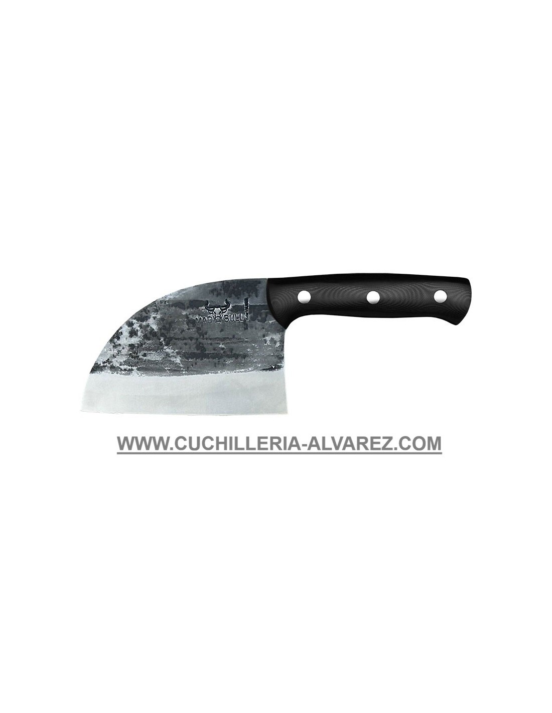 Un cuchillo de chef tradicional serbio, también conocido como la "guillotina infernal", es perfecto para picar, partir, rebanar y trocear. Un cuchillo ligero pero potente con una hoja extremadamente afilada y un perfil convexo. Sirve para cortar cualquier cosa, desde verduras hasta carne. Su acabado forjado a mano le confiere un aspecto único y brutal.