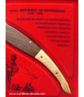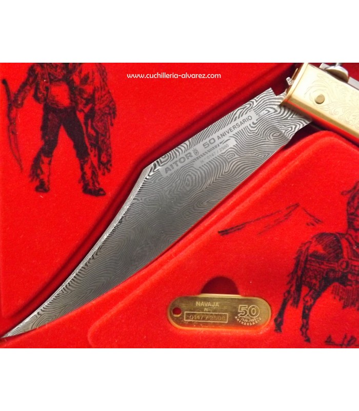 Navaja clásica española Aitor 50 Aniversario (1939-1989). Es una serie limitada de 2.500 ejemplares. Fabricación artesana con acabado especial de Acero Damasco simulado en la Hoja, Mango de madera de Palisandro, Pomo y Contera de Acero Inoxidable, embellecido con un baño de oro de 24 Kt y 0,25 micras con grabados alegóricos. El ejemplar se acompaña de una Placa en el mismo baño de oro, con la numeración de la pieza. Todo ello en su estuche-expositor original, de madera lacada con tapa de metacrilato transparente para exhibir el producto.