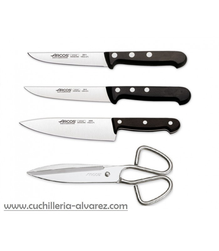 Pack de 3 cuchillos arcos, consta de 2 cuchillos mondadores y un cebollero y tijera arcos de 200 mm.