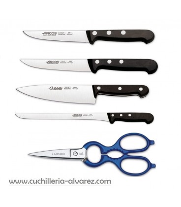 Pack de 4 cuchillos arcos tijera 3 claveles, consta de 2 cuchillos mondadores, un cebollero, un cuchillo jamonero flexible y una tijera 3 claveles.