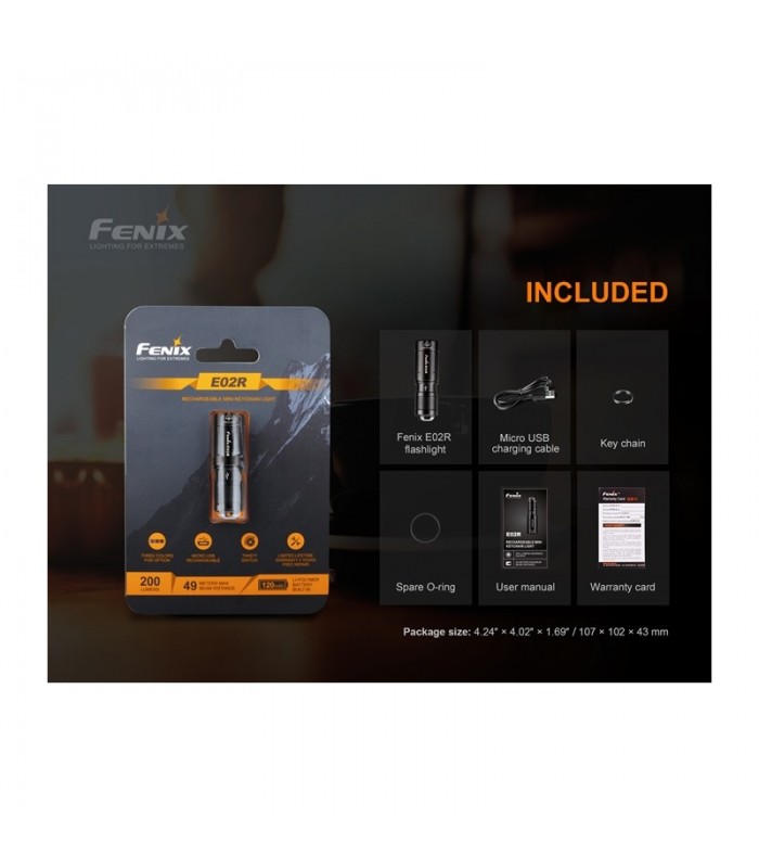 La Fenix E02R es una linterna llavero recargable USB. Esta mini linterna increíblemente pequeña funciona con la batería de polímero de litio recargable incorporada y ofrece un máximo de 200 lúmenes, arroja una distancia máxima del haz de 49 metros. Una cabeza giratoria activa los dos niveles de brillo. Gire la cabeza para acceder al puerto de carga Micro USB. Fabricada de aluminio de calidad, completamente a prueba de polvo e impermeable, esta linterna de llavero es perfecta para llevar todos los días.