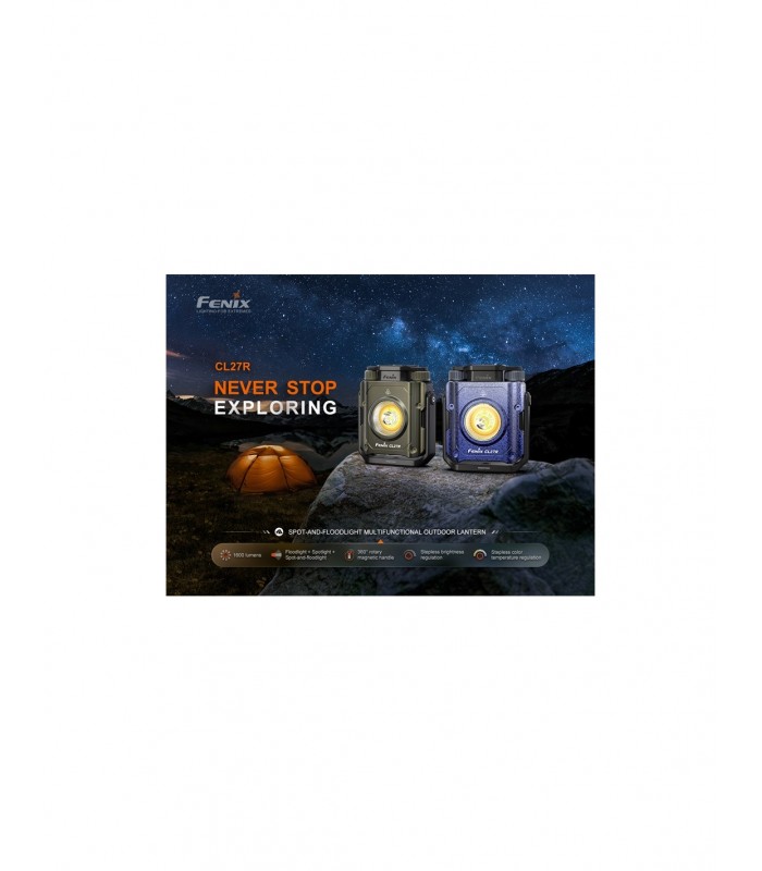 La nueva Fenix CL27R es una linterna de exterior versátil y fiable que puede utilizarse para diversas aplicaciones, desde acampadas hasta operaciones industriales. Presume de una luminosidad máxima de 1600 lúmenes, con capacidad para generar un haz de luz de hasta 180 metros y funciona con una batería recargable de 5000 mAh que garantiza una autonomía asombrosa. Esta linterna cuenta con dos interruptores giratorios que permiten ajustar de forma continua el brillo y la temperatura de color. Con una combinación de proyector, foco, foco y luz roja, podrás utilizar esta linterna versátil para la iluminación de grandes áreas, iluminación de largo alcance y para alertar sobre tu posición.