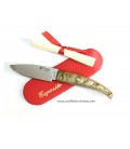 Navaja Exposito P/504-MU con hoja de acero inoxidable sandvik 12c27 de 75 mm y empuñadura de cuerno de muflon con forros de acero y mosaico decorativo de laton.