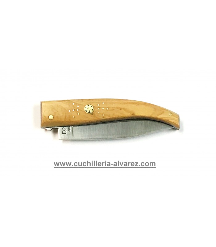 Navaja Exposito P/504-E con hoja de acero inoxidable sandvik 12c27 de 75 mm y empuñadura de madera de enebro con forros de acero y mosaico decorativo de laton.