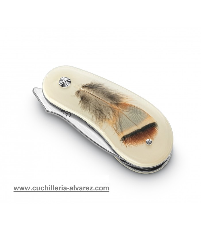 Se utiliza un material exclusivo para la serie Piuma (pluma) y consiste en plumas reales insertadas manualmente (una por una) en una capa de resina acrílica transparente y gruesa. El fondo blanco resalta la belleza de las plumas y la superficie está magníficamente pulida para obtener la máxima transparencia.