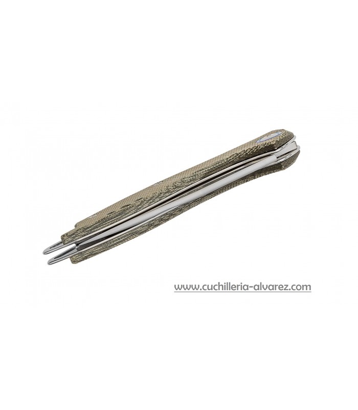 Navaja para juntas deslizantes con hoja de acero BOHLER M390 satinado, apertura a dos manos con ranura para clavos. Mango de micarta de lona verde.