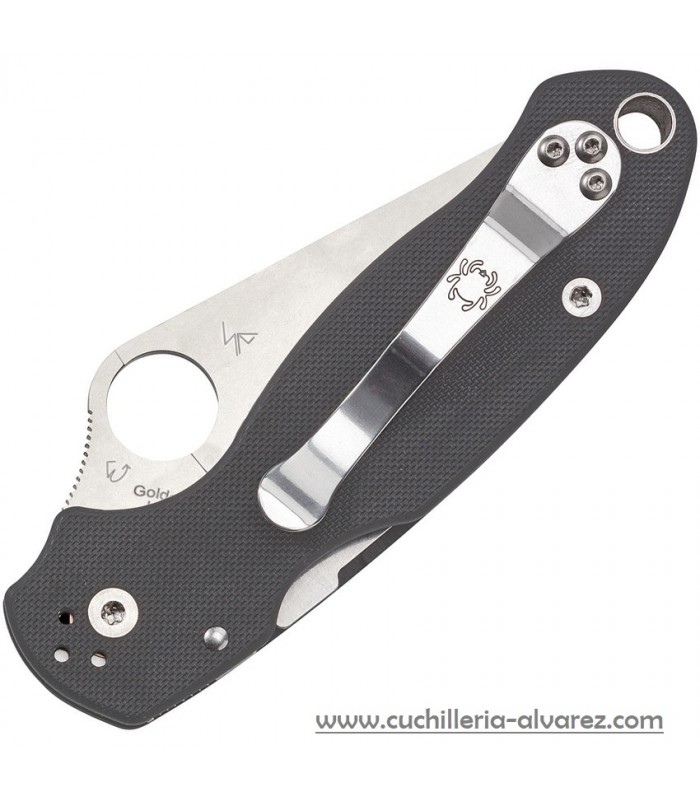 El mecanismo de bloqueo por compresión está cubierto por una cachas de color gris oscuro en G-10. Completan la navaja Spyderco Para 3 un clip que se puede colocar en cuatro posiciones -diestro, zurdo, punta arriba o punta abajo- y un orificio de amplias dimensiones para pasar un cordino.