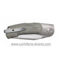 Navaja con sistema backlock avanzado, hoja M390 satinada. Mango con forros y virolas de titanio arenado monobloque y cachas de lona micarta verde.