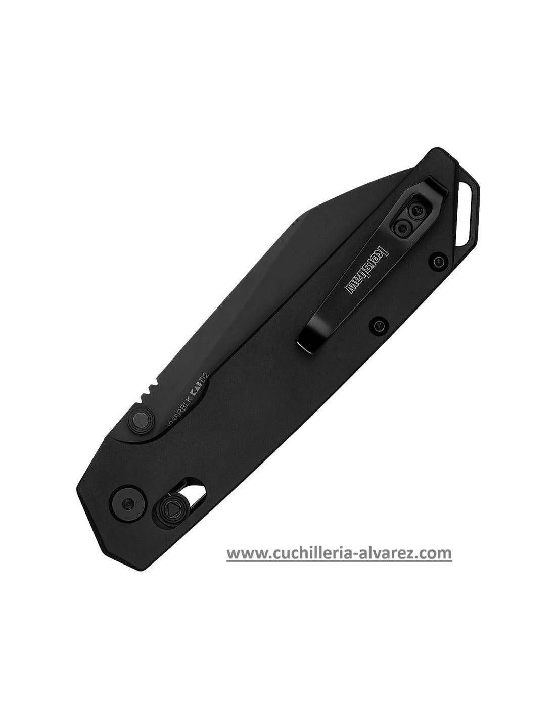 El clip de bolsillo de transporte profundo es fácilmente reversible para llevarlo a la izquierda o a la derecha; espaciador trasero anodizado negro y orificio para cordón; espaciador trasero anodizado negro y orificio para cordón