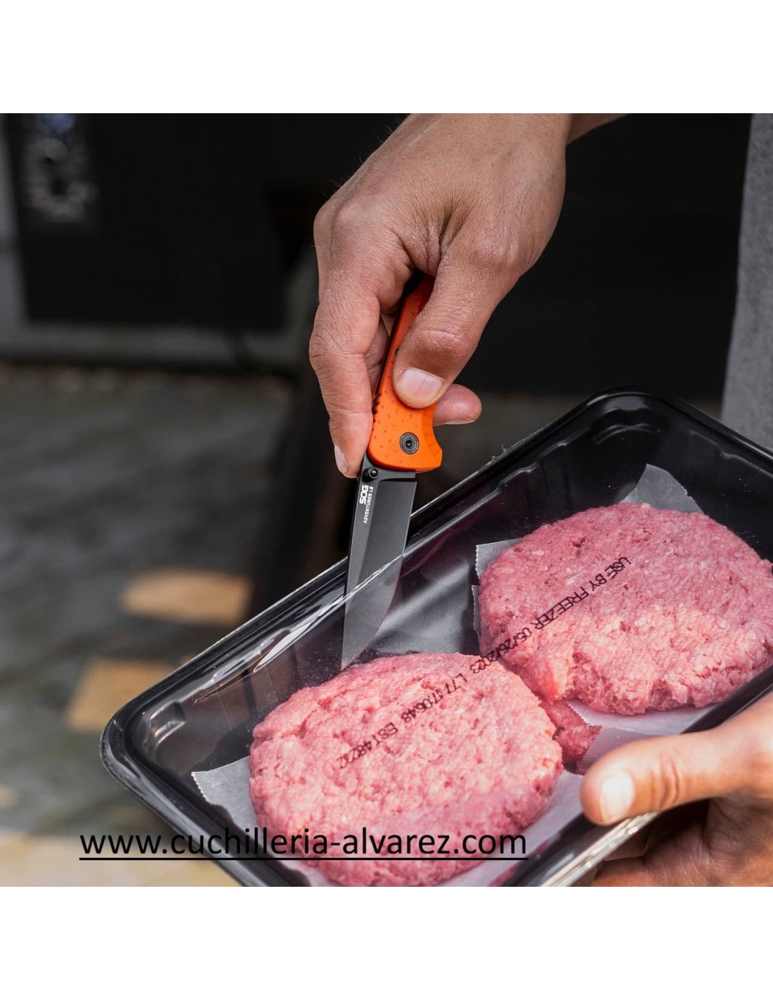 Navaja SOG ADVENTURER LB ORANGE + BLACK 13-11-02-43 con acero inoxidable 5CR15MOV endurecido con CRYO y revestimiento de Ti-Ni, empuñadura de GRN naranja  y seguro backlock.