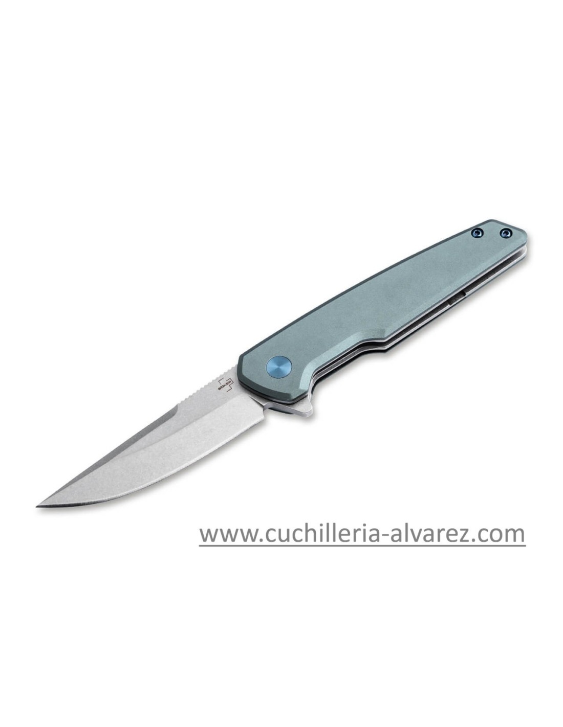 Elementos anodizados en azul brillante , como el clip de la hoja (r) , el tornillo de pivote de la hoja plana y los tornillos del mango , le otorgan a la navaja un aspecto distintivo. El robusto acabado lavado a la piedra y el lomo de la hoja con ranuras antideslizantes y filo falso decorativo completan su aspecto y rendimiento.