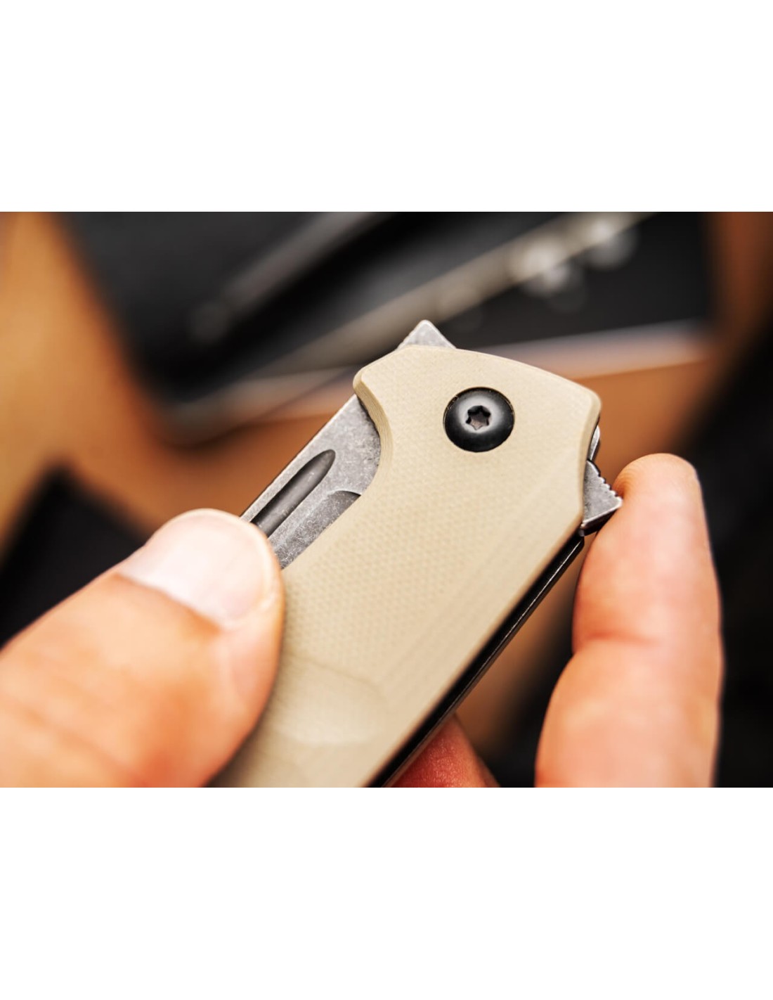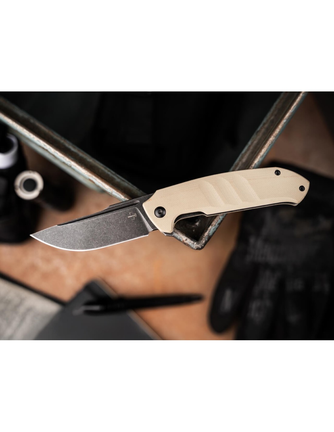 Forjada con vientos arenosos y erosión constante, la Böker Plus Barchan encarna el carácter de las dunas en forma de medialuna del mismo nombre, comunes en regiones desérticas. Más allá del desierto, esta navaja de bolsillo, con su hoja recta 440B, aborda con seguridad diversas tareas cotidianas, desde cajas de cartón y embalajes hasta cuerdas. Prueba innegable de sus influencias geológicas es principalmente el robusto acabado negro lavado a la piedra de la hoja y el mango ergonómico de G10 marrón arena , cuya textura, que recuerda a las ondas del viento, garantiza un agarre seguro. En lugar de arena en los engranajes, esta navaja táctica se basa en rodamientos de bolas suaves, una aleta y una aleta frontal para una apertura de hoja sin esfuerzo, mientras que el bloqueo de línea fija la navaja de forma segura incluso en tareas exigentes. El clip de la punta permite llevar la navaja plegable cómodamente en el bolsillo del pantalón. Atractiva en función, apariencia y precio: una Böker con un plus.