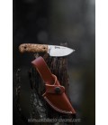 El Mandra FG viene con una funda de cuero color canela con un botón a presión para una fijación segura. Las costuras blancas combinan con el color del forro del cuchillo.